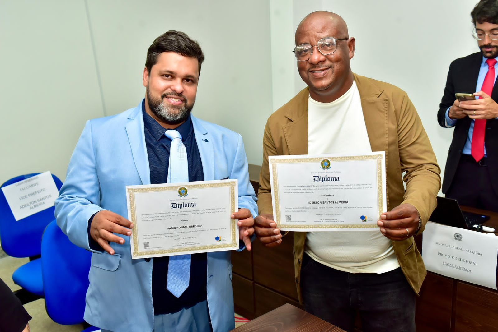 O prefeito eleito de Jaguaripe, Dr. Fábio Nonato (MDB), e o vice-prefeito Adé Almeida (Avante) foram diplomados nesta terça-feira (17) em uma solenidade realizada no Fórum Edgard Matta, em Nazaré. Além deles, vereadores e vereadora também receberam seus diplomas, marcando o encerramento do ciclo eleitoral e o início de uma nova fase para o município. Médico e com 47 anos de idade, Dr. Fábio chega ao comando do Executivo municipal com o desafio de transformar as promessas de campanha em ações concretas. Durante a cerimônia, ele destacou a importância de unir a população em torno de um projeto comum. “Agora é hora de sair do palanque e governar para todos os cidadãos de Jaguaripe. Nosso compromisso é com o desenvolvimento e o bem-estar de cada munícipe”, declarou. A diplomacão marca o reconhecimento formal pela Justiça Eleitoral de que os eleitos estão aptos a exercer seus mandatos. O evento foi prestigiado por autoridades locais, familiares e lideranças políticas, que destacaram a necessidade de um governo participativo e focado nas demandas do povo. Para Adé Almeida, a gestão será orientada pelo diálogo e pela escuta ativa das comunidades. Com a diplomacão concluída, Dr. Fábio e Adé Almeida iniciam a contagem regressiva para a posse. O próximo passo é consolidar a equipe de governo e dar início à execução do plano de gestão, que foi apresentado durante a campanha.